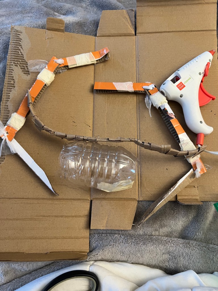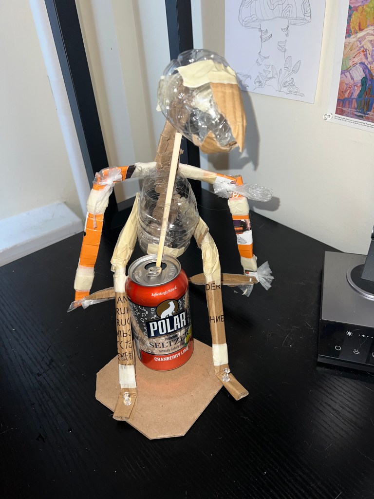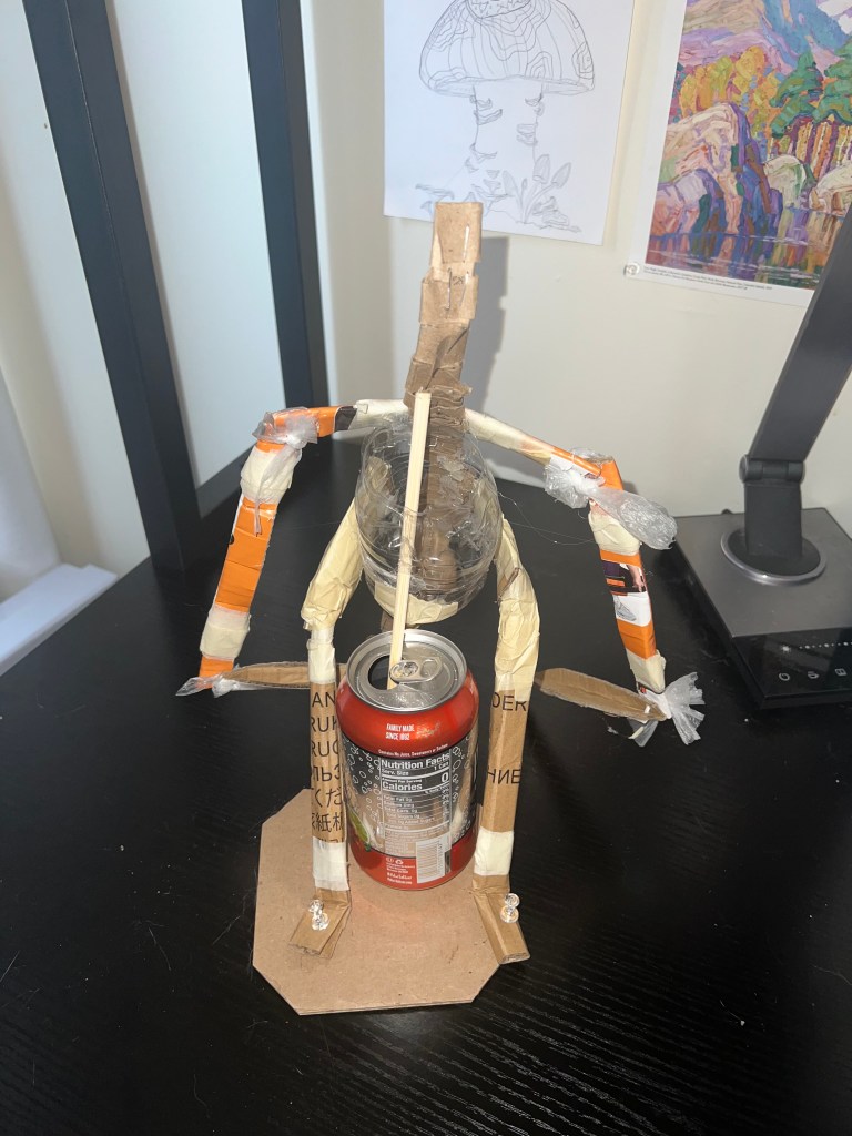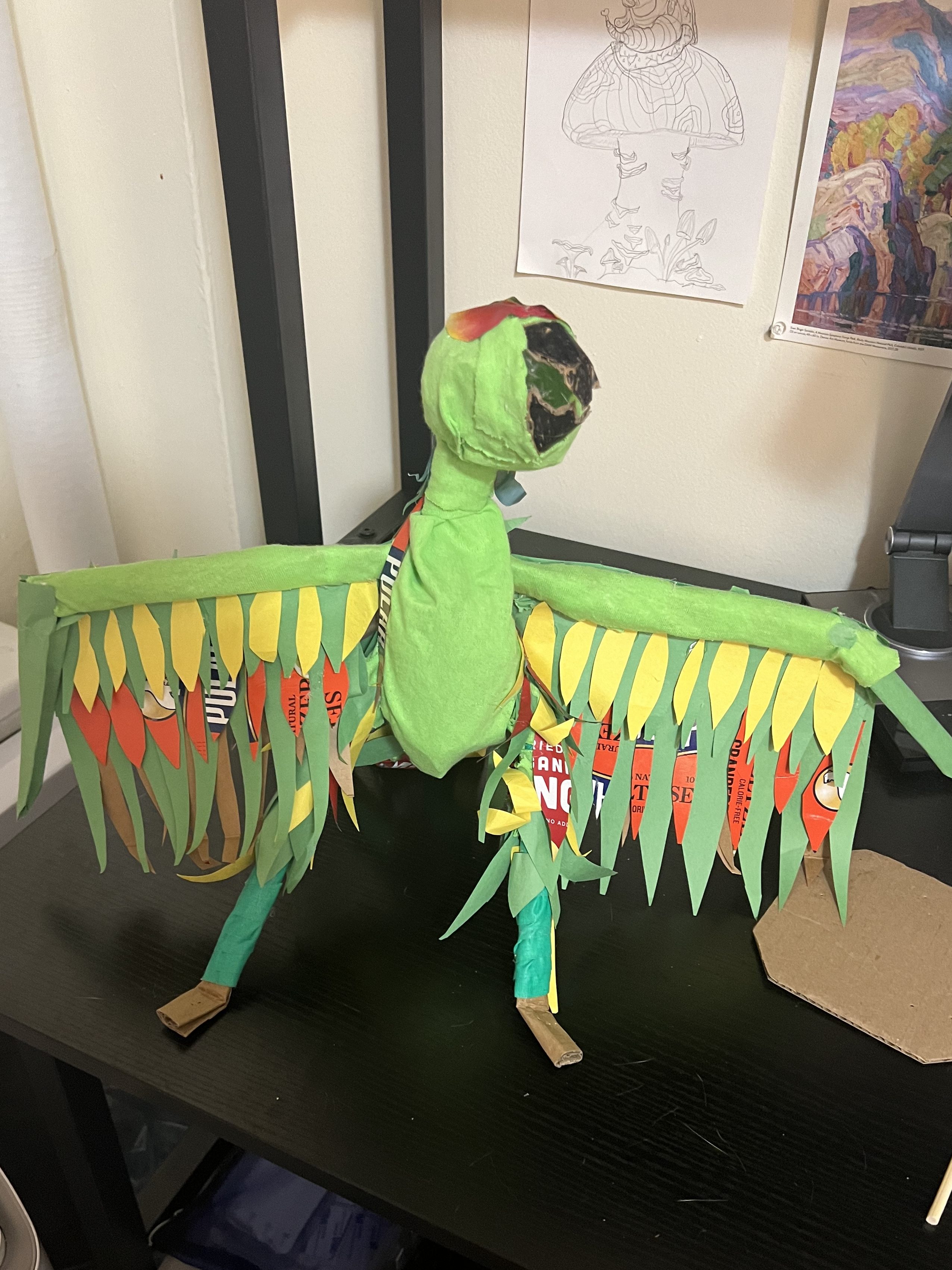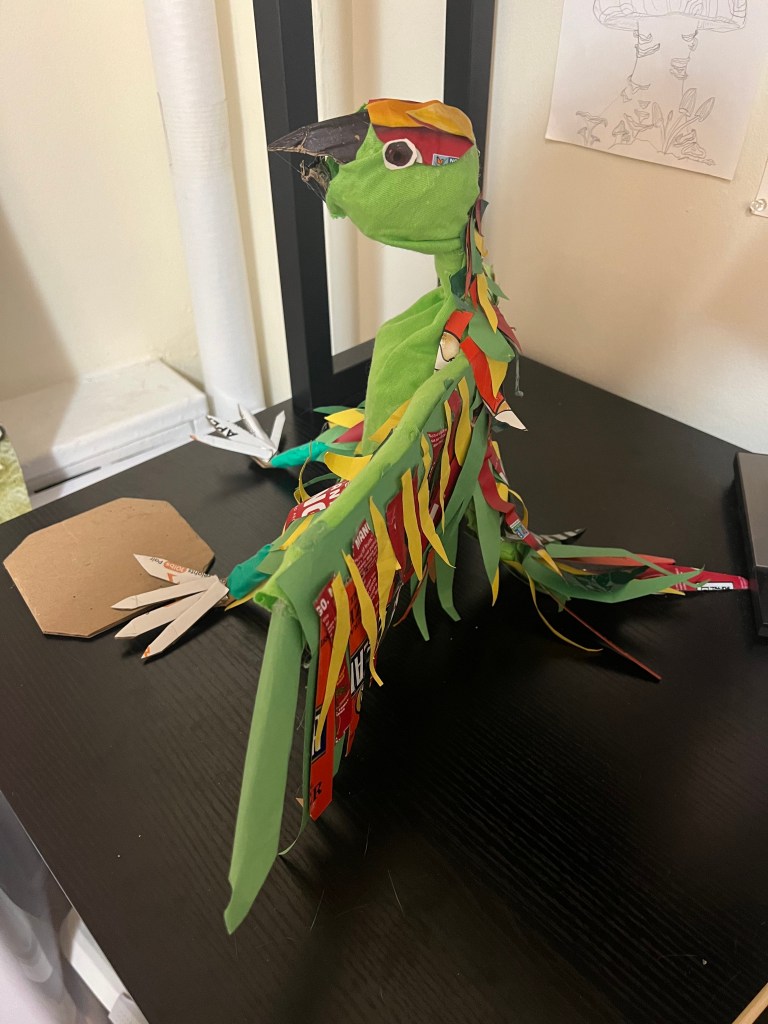 It was challenging to sketch this bird from different angles, and I found myself overthinking various proportions or details. As a solution, I looked up the anatomy of a parrot and used its skeletal anatomy as a reference in both my sketching and my building. Oddly enough, I felt the building phase of this project was more manageable than sketching my ideas, even though I had never crafted a prototype before. I gathered the following materials: cardboard, plastic bags, water bottles, construction paper, old fabric scraps, food wrappers, and paper clips. The first thing I began to build was the spine and rib cage. I used a strip of cardboard and cut slits on the sides and then folded them over each other to form a study but flexible shape. I then took a water bottle and cut the lip and the bottom off. I then began creating my wings by taking cardboard scraps and fastening them with plastic bags to allow for adjustments and movement. I used cardboard scraps for the legs as well, but I secured them to the body by puncturing a hole on each side and fastening it in position using paper clips and a good amount of tape.