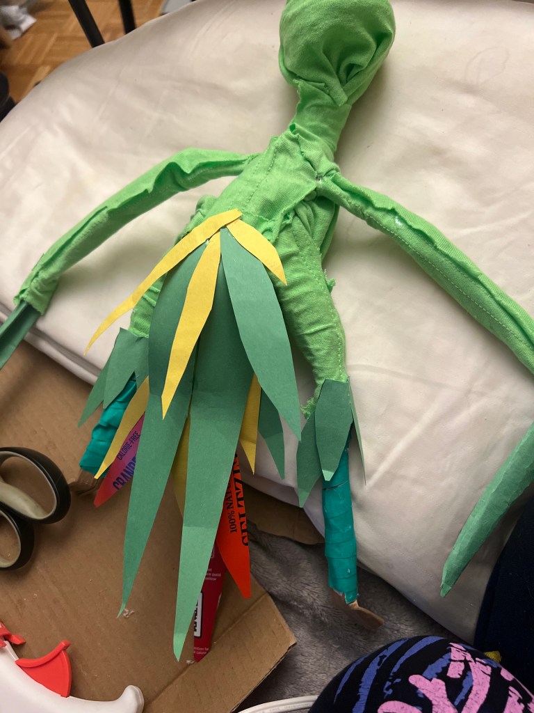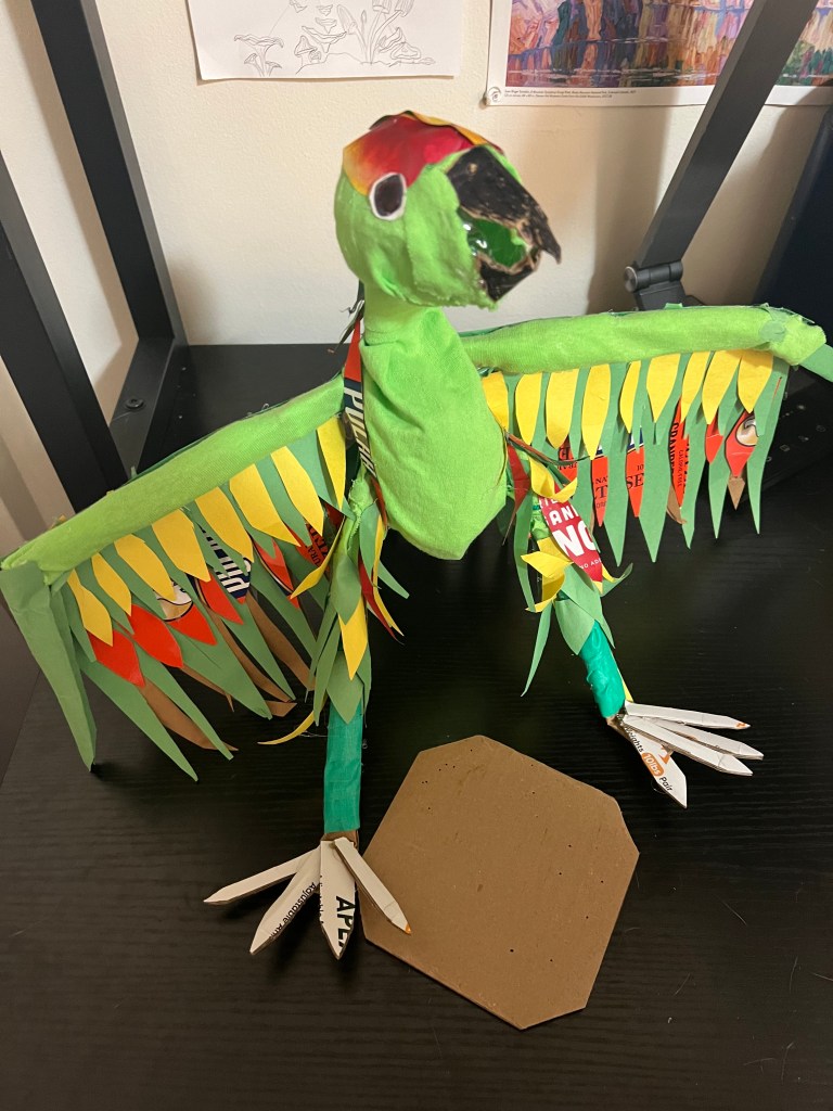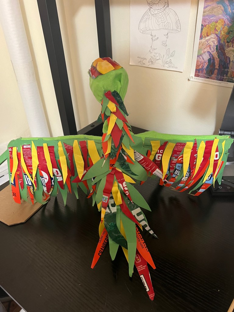 Now that I had crafted the body parts for my parrot, it was time to assemble them. To secure parts in place, I used thumbtacks and hot glue to maintain a hold. I then proceeded to build the head and break using the bottom end of a water bottle and, you guessed it, cardboard scraps. Now that I had a good foundation, I needed to cover my skeleton, and luckily, tucked in the back of my closet was a bag of fabric scraps from an old DIY project. Using colored tape and fabric scraps, I glued around my frame, making mental notes of where I would add and arrange its ‘feathers’. Once I added the fabric, I was concerned because my prototype didn’t resemble a parrot. I almost didn’t want to continue because I worried I would ruin any progress I made. I had a true “trust the process” moment as I began to create feathers using green and yellow construction paper, food wrappers, and the box from a six-pack of seltzer water. I started with the tail and the legs and left the wings for last. I decided to do two rows of feathers for each wing.